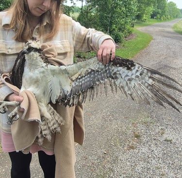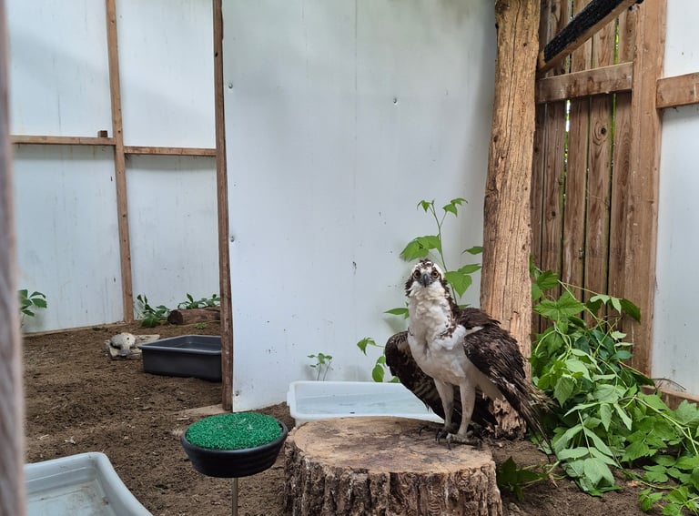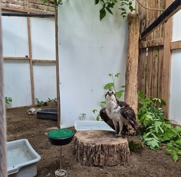An adult Osprey was admitted after flying over a flarestack resulting in his feathers being singed and rending him grounded and unable to fly. This is not an uncommon occurrence and sometimes birds are not found until several days-weeks after the initial incident. This bird was lucky to be found not too long after the accident and was in relatively decent body condition, though thin. Other birds are grounded for longer periods before they are found. Since the feathers are singed, it takes an extended time in care to replace these damaged feathers. Birds with extensive feather damage need to go through their natural moult cycle to replace their damaged feathers. Other birds with only a few damaged feathers can go through a process called imping where damaged feathers are replaced with donated feathers from another bird (either deceased bird or moulted out feathers). In this case, the osprey was going to be in care for an extended period while waiting for a moult to happen. While in care with us, the Osprey received initial treatment (fluid therapy and nutrition) and then he was transferred to The Owl Foundation for continued care and rehabilitation.