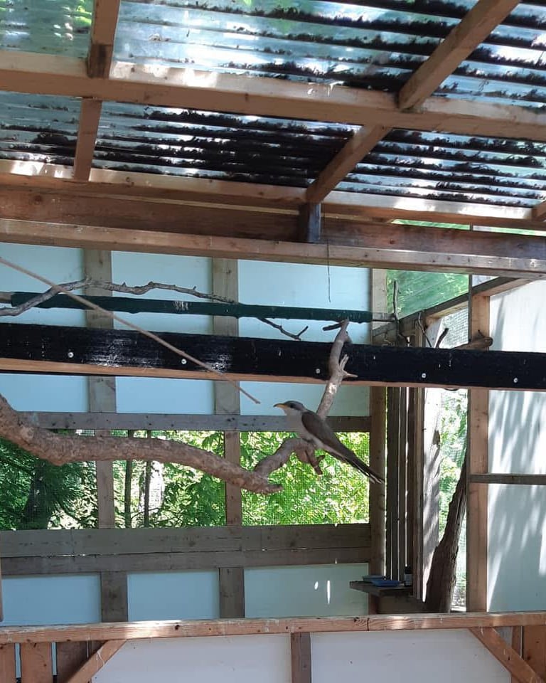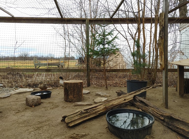 Our rehabilitation centre has a clinic equipped with ICU cages, incubator, and medical equipment (IO fluid therapy pumps, IV fluid warmer, oxygen therapy, opthalmoscope/otoscope etc.) to support our patient's needs. Once a patient has progressed out of the ICU, they are transferred to one of our outdoor enclosures for continued care. Our outdoor enclosures offer limited to unlimited exercise activity, depending on the species. Our enclosures are nestled in the woods and provide shelter from the elements, natural lighting, perches, and stimulation from the natural surroundings. Larger birds (hawks, owls, eagles, osprey, vultures etc) requiring large flight cages are eventually transferred to larger rehabilitation centres as appropriate, for further conditioning.